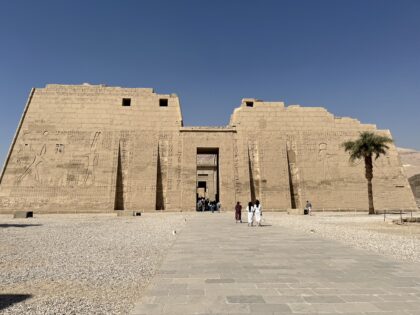 ルクソールの西岸で良かったのは、ハブ神殿でした。ここに行かないツアーも多いそうですが、興味深かったです。入口の門と壁の彫刻が印象的です。この後に寄ったメムノンの巨像はやや肩透かしでした。紀元前3000年くらいに作られたそうで、この地域でも最も古くて大きな像ですが、他に観るものがなかったので、写真だけ撮りました。