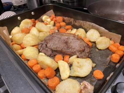 ところが義妹がひどいインフルエンザを発症してしまいディナーはキャンセル、肉を半分もらってきて自宅で夫が調理しました。ローストチキンは冬の間は月2、3回は作りますが、ローストビーフは我が家ではクリスマスの時しか作りません。牛肉が高いからです。今回はサーロインです。結婚した当初はクリスマスディナーはにぎやかでしたが、義両親が他界し、義妹が離婚し、今年はとうとう夫婦だけのささやかなディナーとなりました。夫が作ってくれたローストビーフ、ワインと美味しくいただきました。デザートはオーブンで焼いた栗。