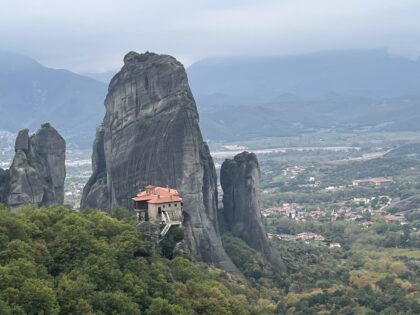 私たちが見学したのは、Roussanou修道院、Varlaam修道院、St Stephan’s Holy修道院です。どれも、よくこんなところに建材を運んだな…と感心します。ガイドさんの説明によると、13世紀ごろに修道士たちが洞穴のようなところに住み修業をし、15世紀ごろオスマントルコから逃れるために山の上に建てたのだそうです。垂直な崖をどうやって登ったかというと、岩に酢を垂らして穴をあけ、そこに板を載せて足場にしたのだそうですが、建設途中で何人も落下して亡くなったのだそうです(そりゃそうでしょう…)。今でも足を滑らせたら真っ逆さま、見下ろすと足がすくみます。修道士たちが祈りを捧げ、命がけで守ってきた神聖な場所です。中はチャペル、小さい庭やバルコニーや元台所があります。